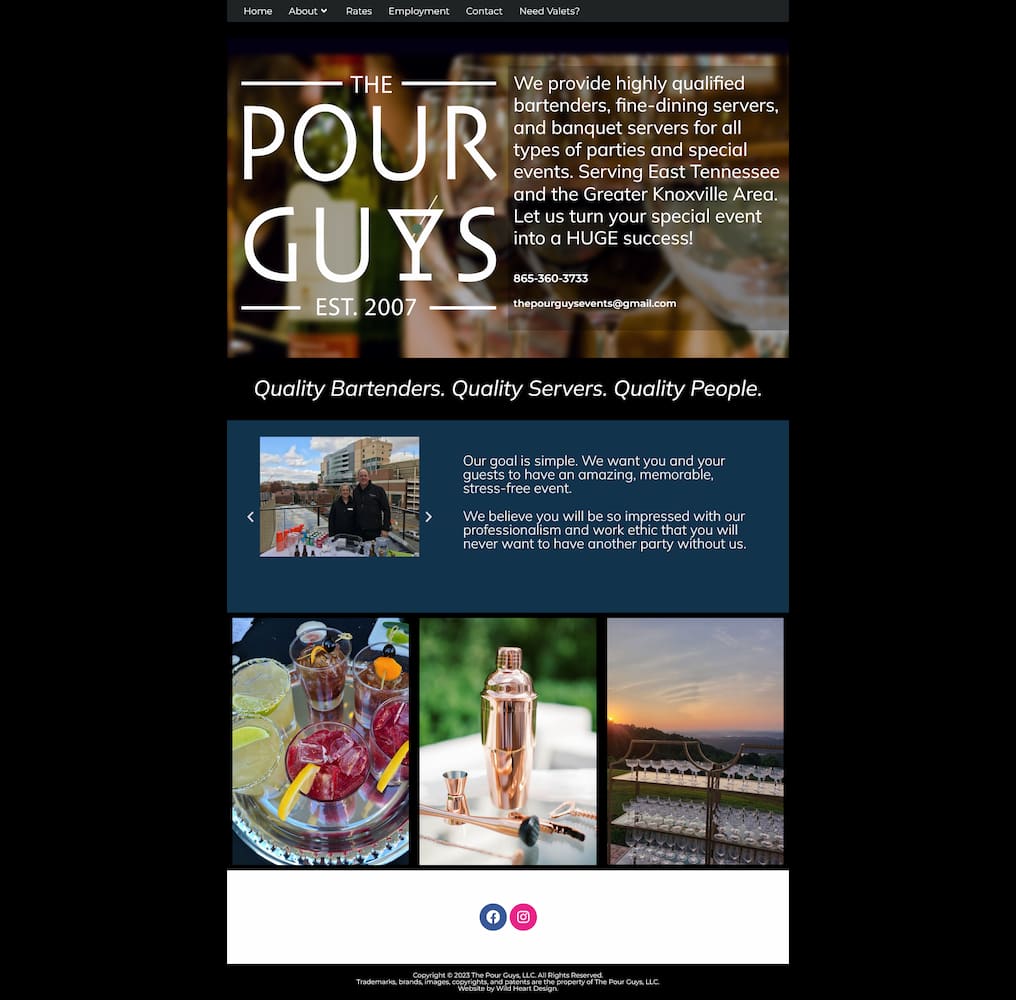 I designed and developed a custom WordPress website for The Pour Guys, a bartending and event staffing company serving East Tennessee. The goal was to create a professional, easy to navigate site that clearly explains their services and makes it simple for potential clients to get in touch.